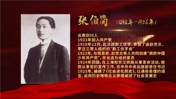 張伯簡,1898年生於雲南省劍川縣,白族,早年曾入滇軍。1919年,為追求真理辭去滇軍中的軍需官職務,赴法國勤工儉學。在法國勤工儉學期間,張伯簡參加了由趙世炎、李立三等人組織的「勞動協會」的活動和法、德兩國工人運動,在鬥爭實踐中逐漸接受了馬克思主義。1921年冬在德國柏林加入共產黨。 1922年,他與周恩來、趙世炎等人在巴黎共同創建了「旅歐中國少年共產黨」,被選為組織委員。他身在異域,卻時刻關心家鄉的革命,寫信給雲南學聯,鼓勵青年學生學習馬克思主義。同年秋,張伯簡進入莫斯科東方大學,系統地學習了馬克思主義理論,同時對第一個社會主義國家的政治、經濟等各方面的情況進行了解和研究,成長為一個具有較高理論水平,又有實際鬥爭經驗的馬克思主義者。 1924年,張伯簡回國後在上海和京漢鐵路從事革命活動,繼而從事黨的宣傳工作,任中共中央出版部首任書記,負責過黨刊《嚮導》和《中國青年》的編輯發行工作,為馬克思主義在中國的傳播做出了貢獻。 1925年1月,在中國社會主義青年團第三次全國代表大會上,張伯簡被選為團中央候補委員,代理團中央農工部主任。1925年秋奉調廣州,擔任中共廣東區執行委員會委員、軍委書記等領導工作。 在艱苦的革命鬥爭中,張伯簡還努力研究馬克思主義理論,翻譯介紹馬克思主義學說。他編纂的《社會進化簡史》一書,言簡意賅,通俗易懂,是我國較早用歷史唯物主義原理闡述人類社會發展史的理論著作,在早期馬克思主義的宣傳中起了重要作用。1926年毛澤東在廣州舉辦農民運動講習所時,該書被列為學生的課外讀物。抗日戰爭時期,毛澤東曾將此書作為學習唯物史觀和社會發展史的書目予以推薦。 1926年8月,張伯簡參加省港大罷工,領導群眾開展鬥爭,因積勞成疾,不幸在廣州病逝,年僅28歲。